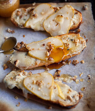 Toast sourdough and rub with fresh garlic, top with cheese and let it melt slightly in an oven, top with fresh cut pear and pinenuts then drizzle with Sweetree Four Brothers honey.