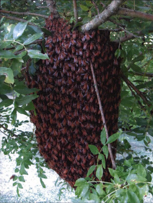 Mainly in springtime you may see a very large group of bees flying together or you may see a big clump (like a ball) of bees hanging from a branch, on a fence, against your house, or some other place. This is a swarm of bees. A swarm is when a queen bee takes a large group of worker bees (usually about 50-60% of the hive) with her and leaves the hive to find a new home. It is a natural means of reproduction for bee colonies. A swarm of bees could consist of thousands to tens of thousands of bees.