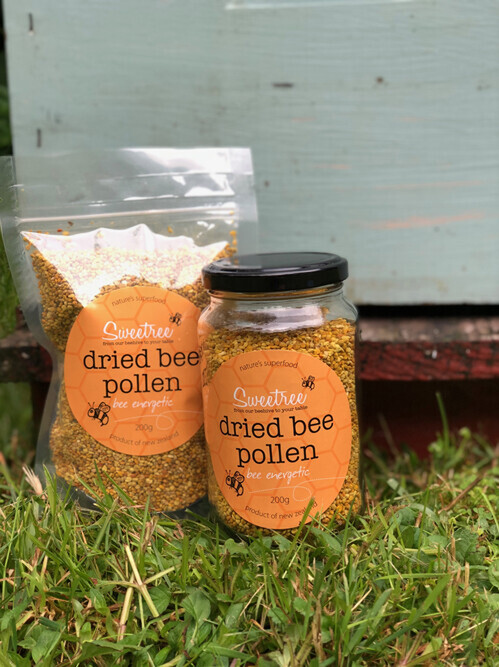 Sweetree Bee Pollen is collected from our home apiary site at rural Horsham Downs, near Hamilton. With abundant nearby flora, Sweetree honey bees gather pollen from a wide range of flowering plants, reflected in the many different colours of pollen. These colours indicate a highly nutritious bee pollen and we have received many favourable comments from our customers regarding its effectiveness. We ensure that our bee pollen is kept as fresh as possible, storing no longer than the previous season.