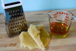 - Shave the wax to speed up melting, add it to the oil in a graduated bowl to make up the 4 cups.