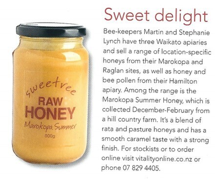 Bee keepers Martin and Stephanie Lynch have three Waikato apiaries and sell a range of location-specific honey from their Marokopa and Raglan sites, as well as bee pollen and honey from their Hamilton apiary. Among the range is the Marokopa Summer Honey, which is collected December-February from a hill country farm. It's a blend of rata and pasture honeys and has a smooth caramel taste with a strong finish.